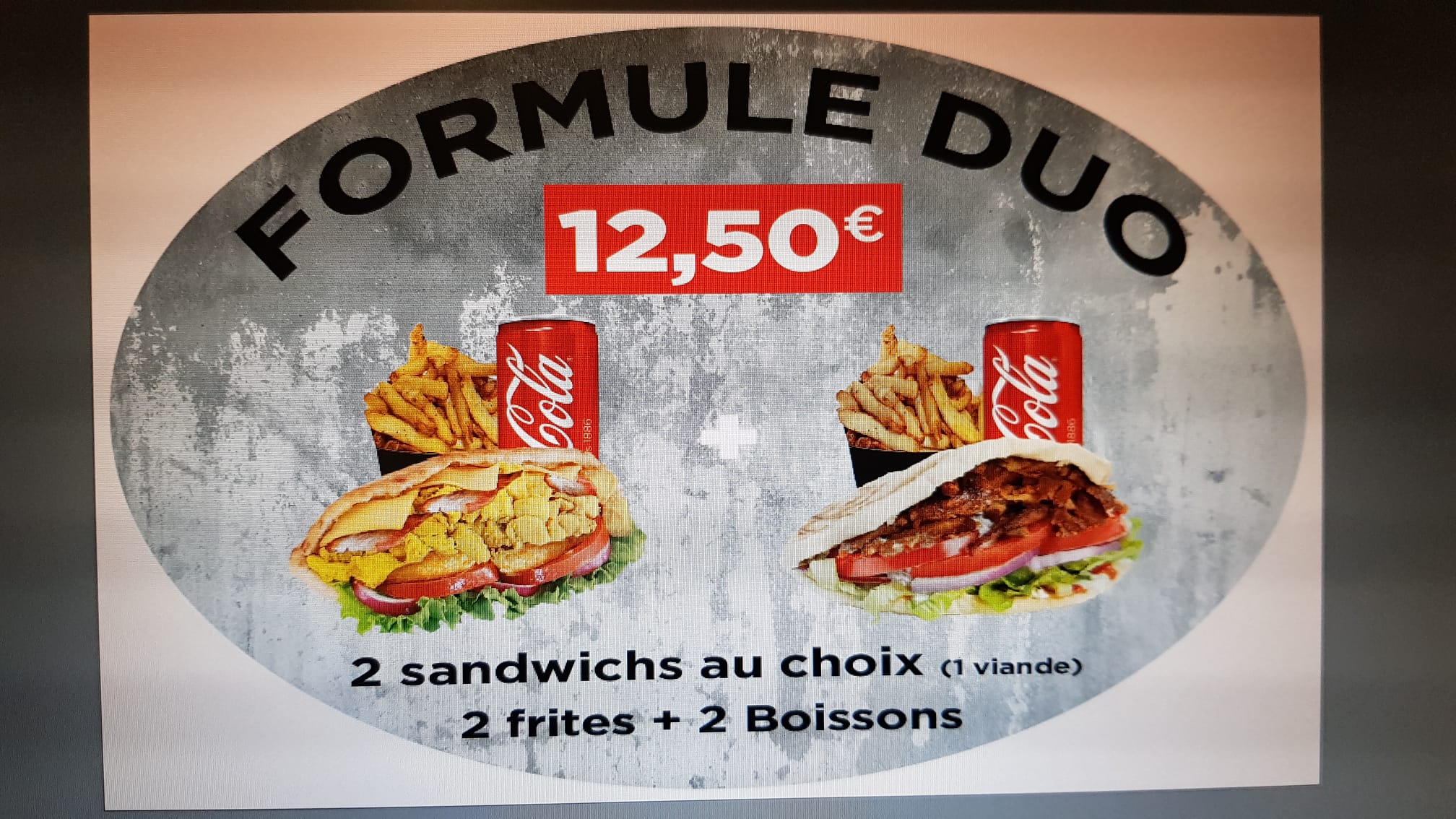 Livraison à domicile j'ai pris une galette kebab complète en royale donc avec oeuf steeak sauce poivre les frite surgelées sont cuites dans une huile très vieille d'ou le goût mauvais . La viande kebab très fades rien de rôti les steak 3mm hyper cuit l'œuf je ne l'est pas vue et sur la quantité vraiment petit.