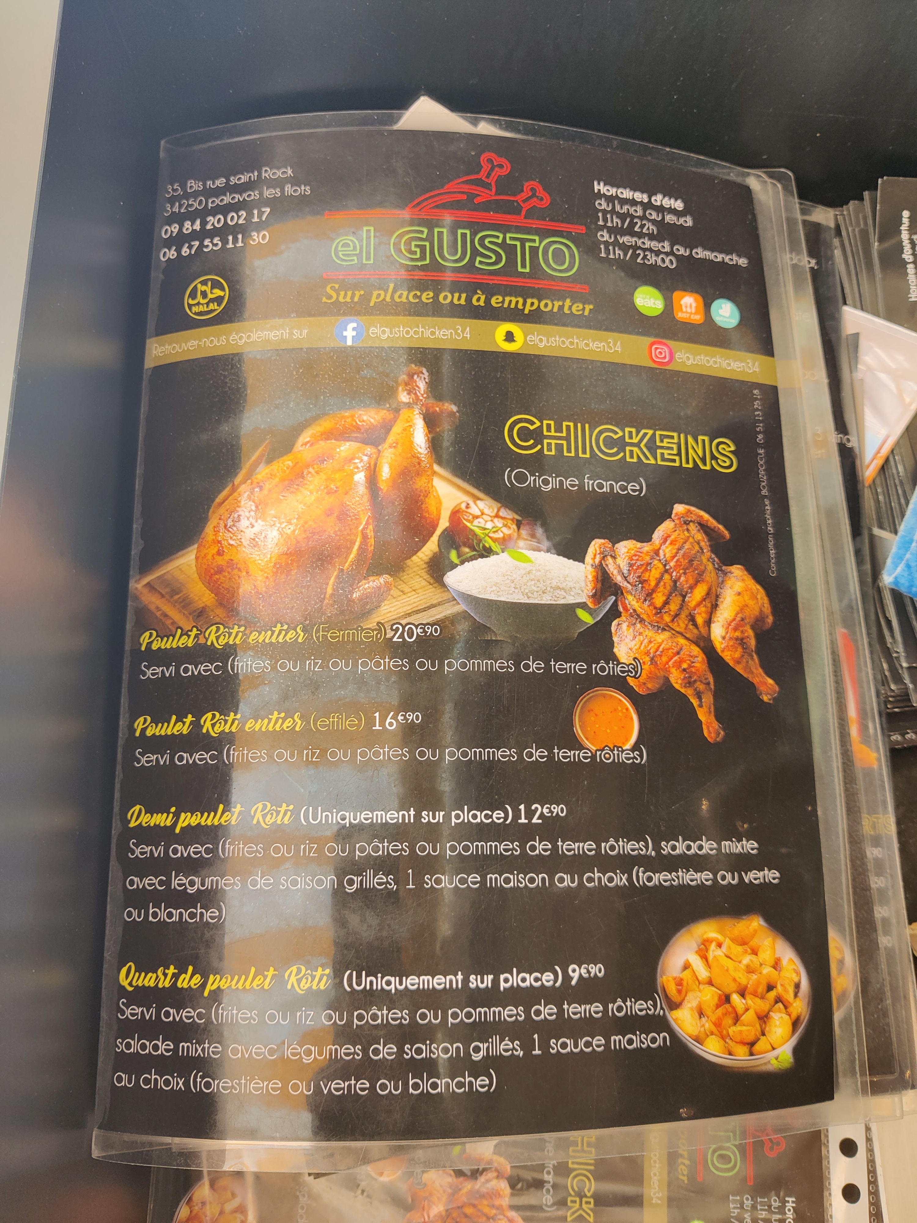 Bonne adresse, les poulets sont délicieux( cuisson au top) accompagné de pommes rôtis. Nos enfants ce sont régalés avec les hamburger 🍔 filets de poulet.
