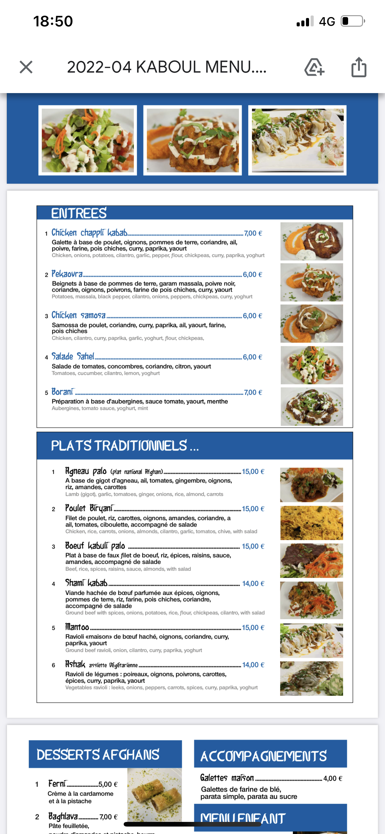 Posté le 29/09/2018 à 19:00"Nous ne connaissions pas du tout la gastronomie Afghane, ce fut donc une grande découverte. Au final le repas était très bon, plein de saveurs nouvelles. Le personnel très accueillant et sympathique. Attention certain plat peuvent être un peu épicé. Je recommande."
