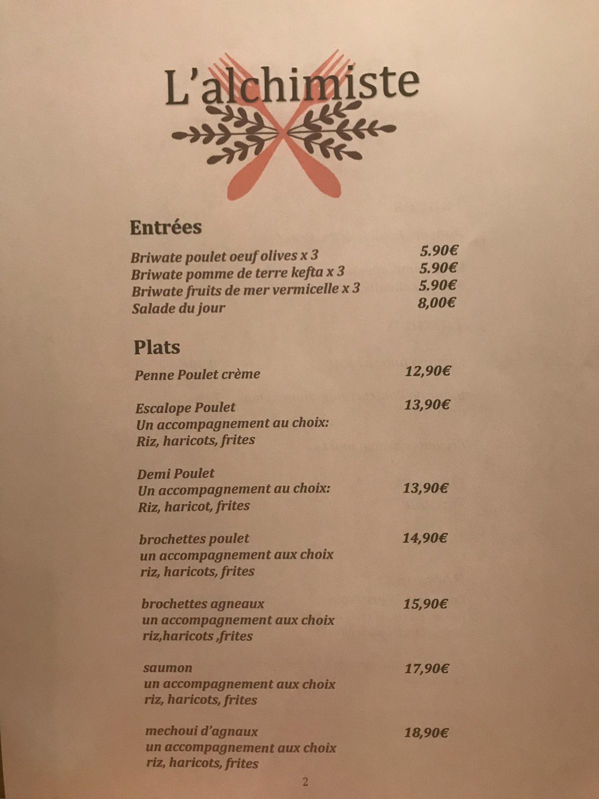 Posté le 30/12/2018 à 04:01"Personnels très accueillants, pour ce qui concerne la nourriture y a plusieurs choix en passant par le classique escalopes frites aux tortillas, bonne continuation pour l'équipe de l'alchimiste....."