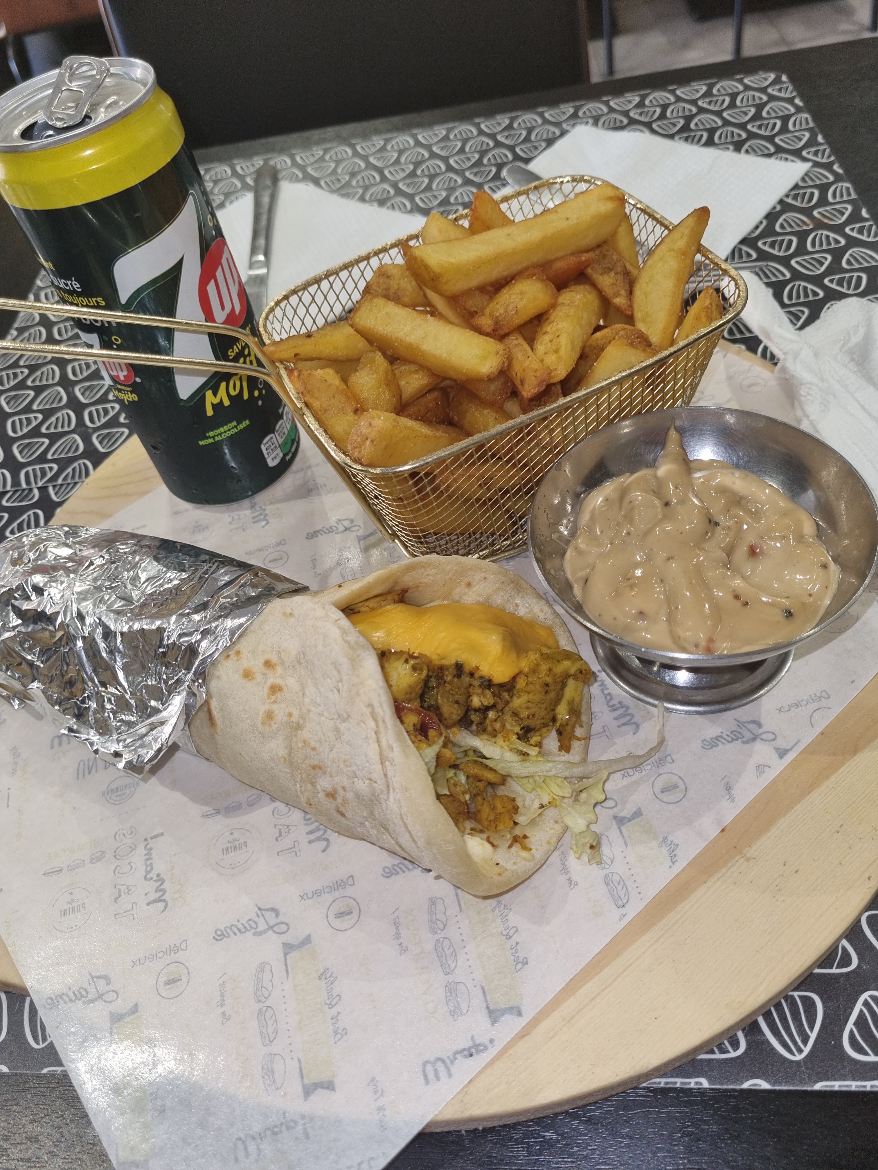 Mon mari et moi n’avons jamais été autant déçu d’un fast-food de notre vie et pourtant, nous ne sommes vraiment vraiment pas difficile. Le menu sandwich de mon mari à + de 14 € était infecte selon lui (le pain était très très blanc absolument pas croustillant et de la sauce qui dégoulinais de partout voir photo) ayant un très gros appétit il n’a absolument pas fini son sandwich. Les frites étaient absolument pas croustillantes et blanches. Moi je me suis pris un cheese naan, Étant habitué à en acheter ailleurs, j’ai été Très déçu, le naan était tout plat, très sec et normalement dans un cheese naan le fromage est à l’intérieur du pain. Là c’était des toastsinette posées dans le sandwich. Il y avait un brin de salade à l’intérieur. Je n’ai pas pu le terminer tellement qu’il était sec, cela se voyait que c’était sûrement du congelé il n’était absolument pas frais. Malheureusement, pour nous, cet établissement est à bannir.