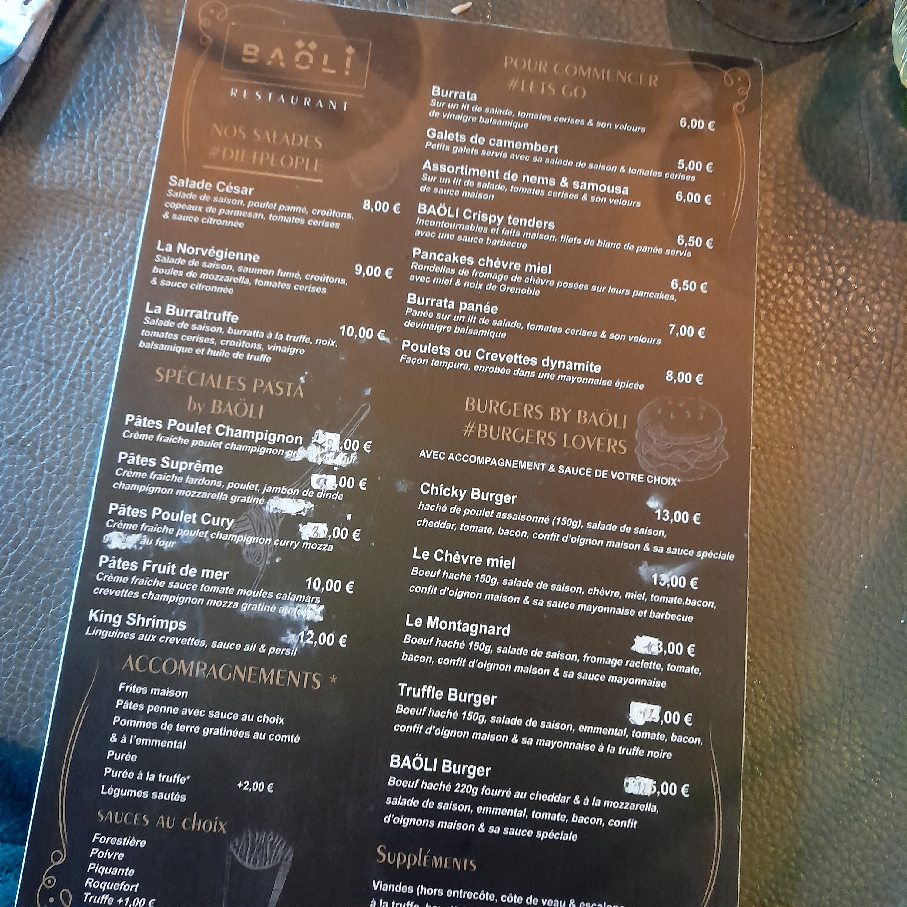 Posté le 16/10/2024 à 20:32"“Même” burger sur les deux photos. La première photo il y a quelques mois et la deuxième ce samedi 19 octobre 2024. Le fameux Baoli Burger qui porte le nom du restaurant. Bien la dernière fois que je met les pieds là bas, plus le temps passe moins les « cuisiniers » mettent d’ingrédients et surtout moins ils y mettent du cœur à faire les plats. Ah c’est sur la décoration des assiettes es cool à regarder mais si seulement les plats suivaient… Le burger est bien évidemment rester dans l’assiette, viande sèche, cheddar ( la photo parle d’elle même ), galette de pomme de terre alors que dans aucune cas elle est notée dans la description. Bref j’arrête la… Bonne continuation. Réponse au restaurant : Arrêter de vous foutre de la gueule des gens je suis rester correct sur le premier avis et même face au serveur sur place. Ce n’est pas qu’une question de pain mais aussi une question de galette de pomme de terre qui n’a rien à foutre la, un steack haché qui devais être fourré au cheddar et à la mozza, le steak était aussi sec que les cuisiniers, pas d’emmental, pas d’oignons ni frit ni cru ni rien, sauce spécial qui n’a rien de spécial puisqu’on la voit dans tout les restaurant. Et le fameux morceau de bacon qui a était rajouter quand j’ai fait la remarque au serveur que ce qui m’a était servis n’était pas ce que j’avais demander il m’a dit désolé ils l’ont oublier. Donc c’est juste pour du pain ça ? Et je l’est payer malgré que je ne l’est pas toucher. Remettez vous en question."