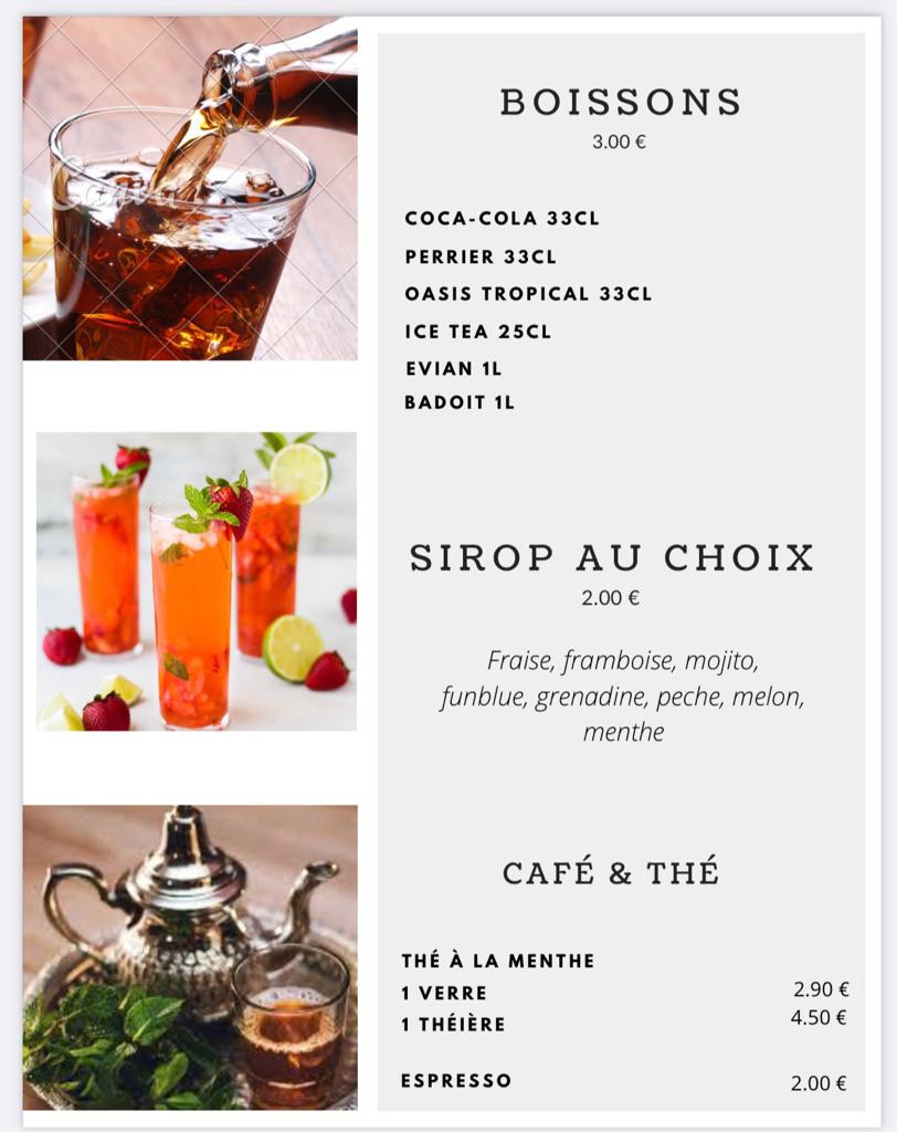 Posté le 27/10/2021 à 11:22"La carte du restaurant est correct, vous avez le choix entre des couscous, tajine et des viandes cuites à la braise. Nous avons bien mangé que ce soit l'assiette mixte et le poulet braisé, mais seule la brochette de poulet citronné avait un goût moyen. La serveuse est sympathique et serviable. Ils proposent également un thé et des pâtisseries faits maison."