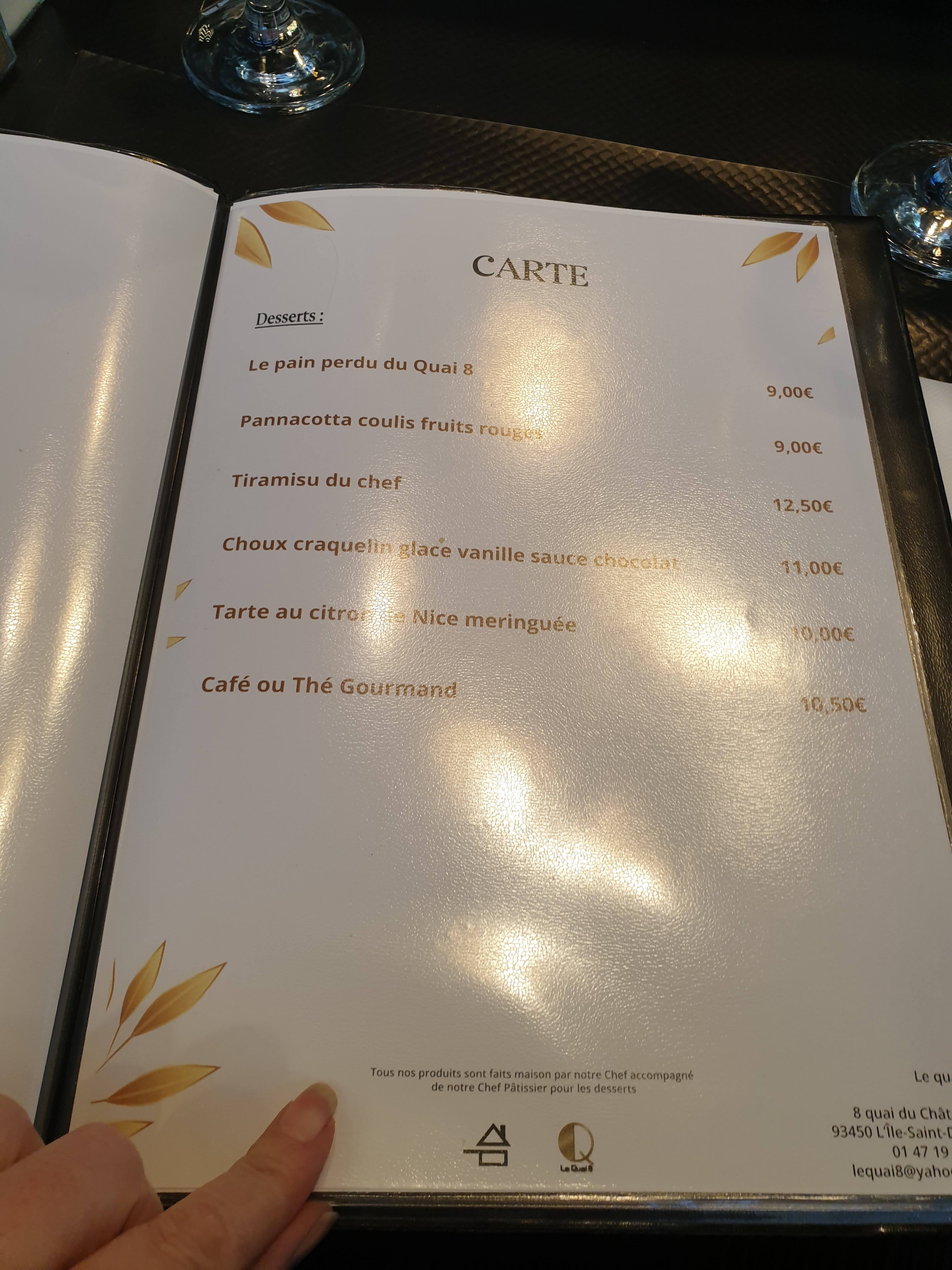 Posté le 28/01/2020 à 22:47"Nous sommes allés déjeuner au restaurant le quai 8 qui comme son nom l’indique se trouve sur les quais de Seine à l’île St Denis. Le restaurant est très joli déco épuré, mobilier soigné, ambiance chaleureuse. Dommage que nous n’avons pas ressenti cette chaleur dans nos assiettes.!!! Le menu du déjeuner est pauvre ce qui est dommage car si ça ne convient pas on doit se rabattre sur les plats à la carte qui demeurent trop chères pour un déjeuner, d’ailleurs il n’y avait pas foule et c’est dommage pour un si beau et grand restaurant. En ce qui concerne le contenu nous avons opté pour le menu du jour : En entrée c’était salade et fromage. Alors comment dire sans paraître méchante ni insultante 🤔🤔🤔 On m’a servi une entrée de cantine scolaire, 2 morceaux de fromage, de part et d’autres de l’assiette et au milieu des feuilles de laitue à la vinaigrette. Je ne comprends pas comment on peut servir ça dans un restaurant ??? Le plat du jour est un poisson quelconque assurément trop cuit accompagné de légumes du soleil congelés regorgeant d’huile et de gras. Le plat à la carte est sans intérêt et ne mérite même pas un commentaire (car la je serais méchante pour le coup) Enfin la burrata était très froide ❄, et avait que très peu de goût si bien que j’ai préféré l’entrée laitue fromage de mon ami c’est vous dire.."