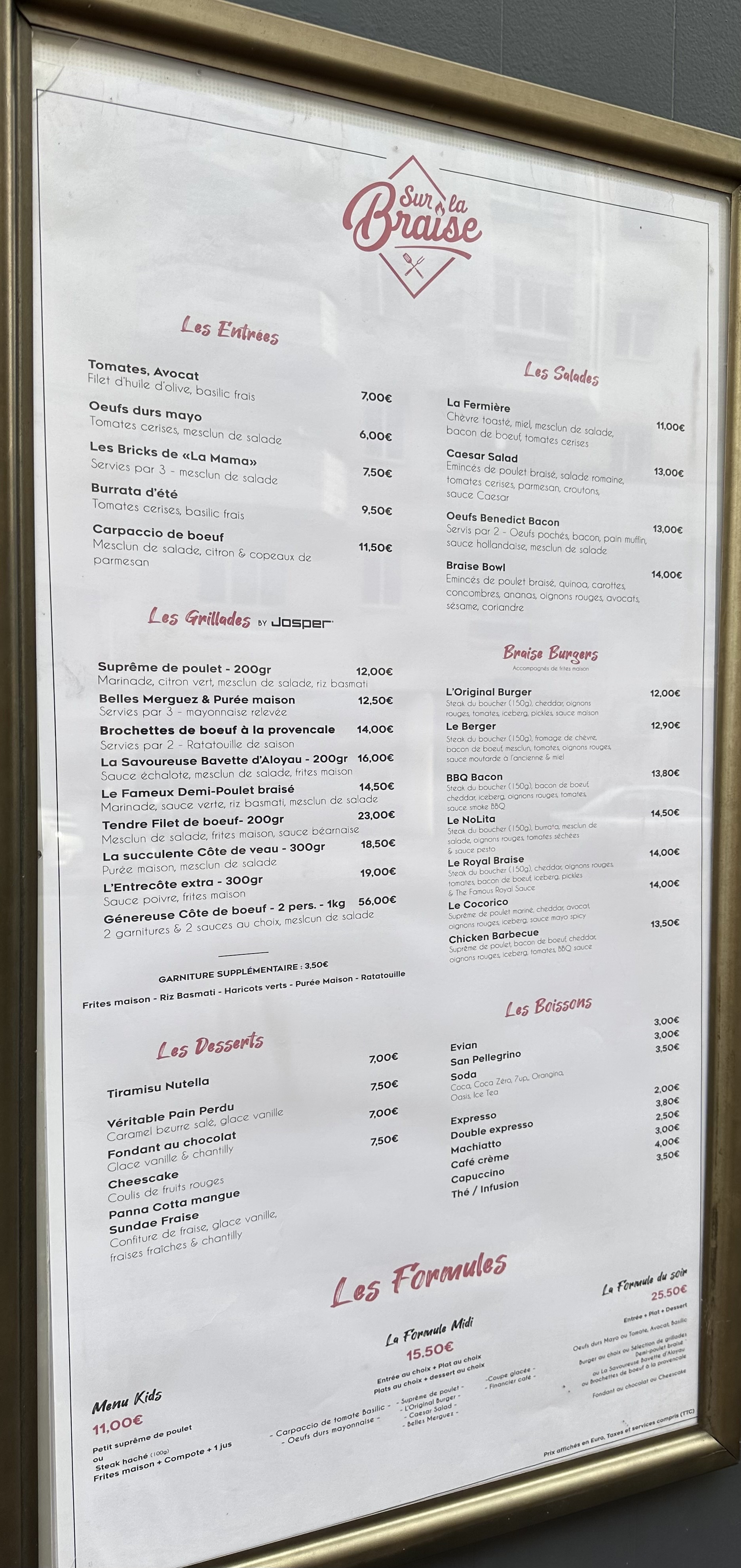 Super concept ! Encore faut-il savoir faire cuire une viande qui plus est à la braise ! L entrecôte devait être saignante, elle était plus qu’à point ! Mis à part ça, les frites était bonne !